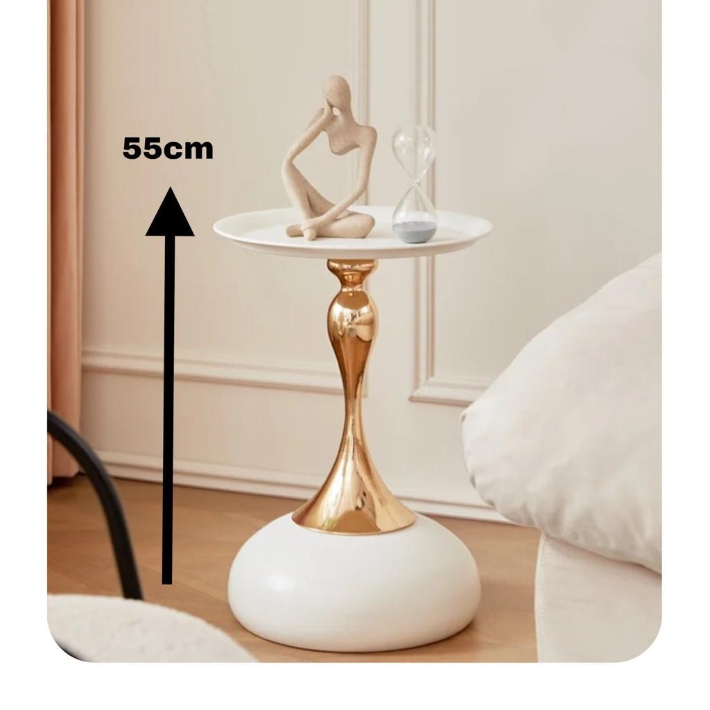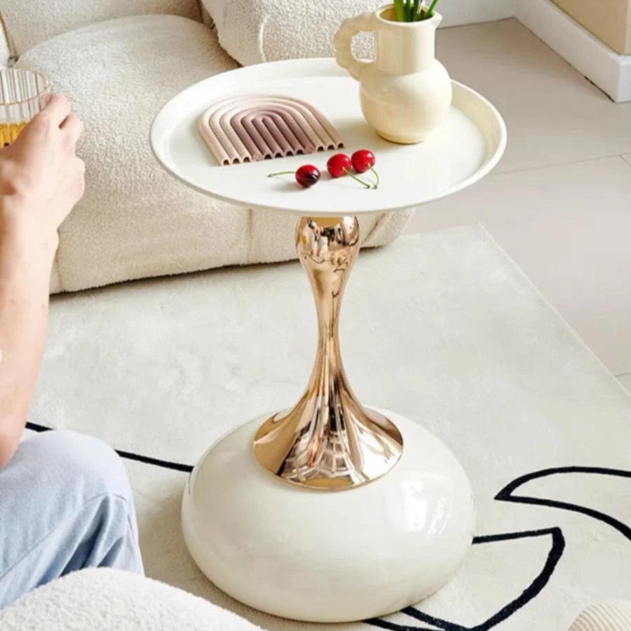 لإضافة لمسة من التميز والفخامة إلى ديكور الغرفة نقدم لك طاولة الخدمة الأجمل والمميزة بتصميم بقاعدة كروية وسطح دائري مزود بحواف جانبية، مثبت على حامل من الستانلس ستيل الذهبي الذي يضفي لمسة من الفخامة من خلال التباين اللوني الحاصل، هذه الطاولة مناسبة للديكور المنزلي أو لديكورات المقاهي الراقية.