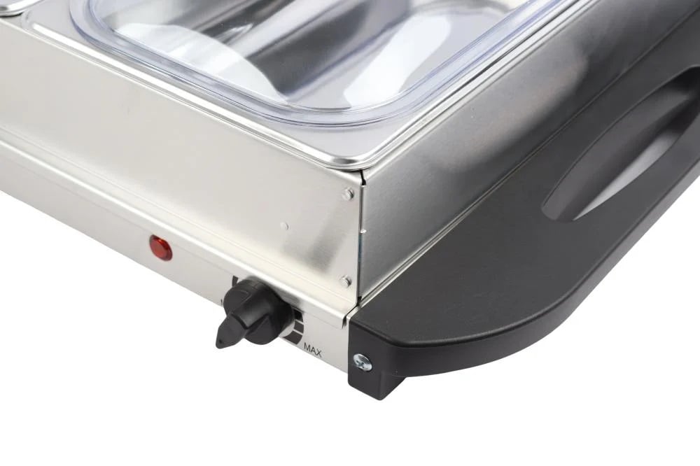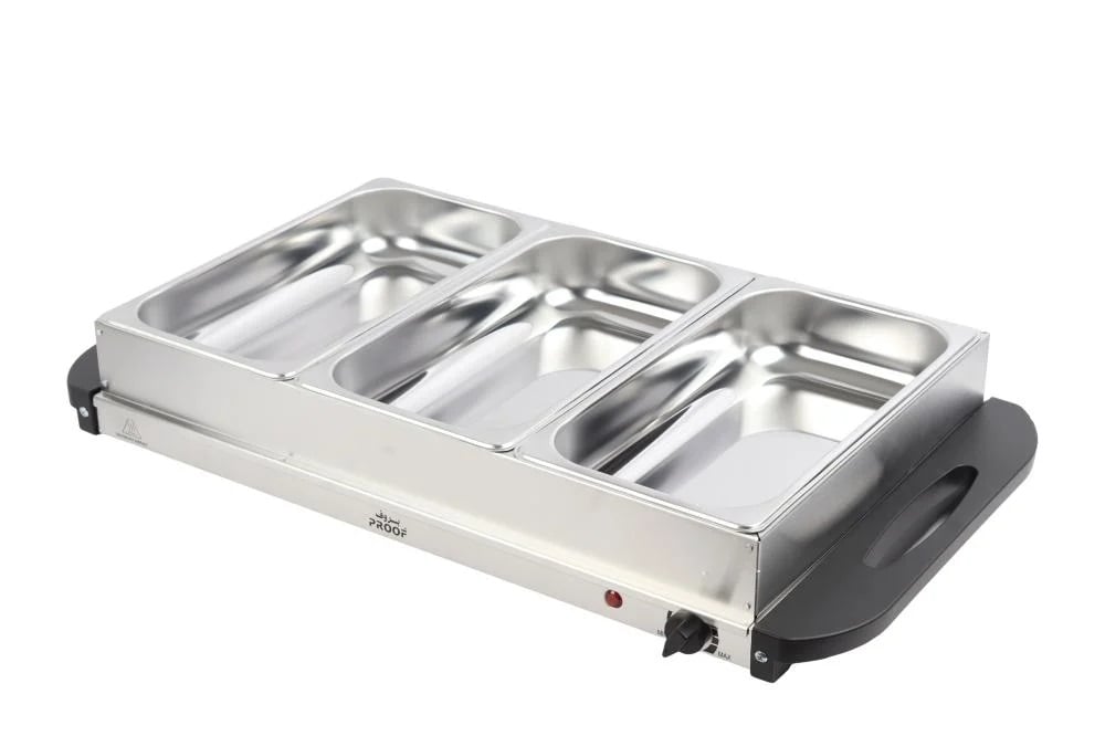 سخان بوفية كهربائي من شركة بروف متكون من ثلاث خانات سعة 2.5 لتر لكل خانة, مصنوع من مواد عالية الجودة تضمن لك الاستخدام المتكرر, يتميز سخان بروف بإمكانية التحكم بدرجة الحرارة كما انك لن تضطر للانتظار طويلا قبل الاكل فبمجرد تشغيل السخان سيكون اكلك جاهز خلال ثوان فقط, يتميز ايضا بمقابض عازلة للحرارة مع ارجل تمنعه من الانزلاق, كما انه يحتوي على غطاء شفاف يسمح لك بمراقبة طعامك دون الحاجة لفتح الغطاء, 200 واط, 60-50 Hz
