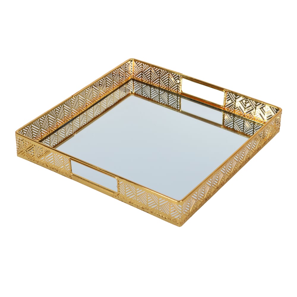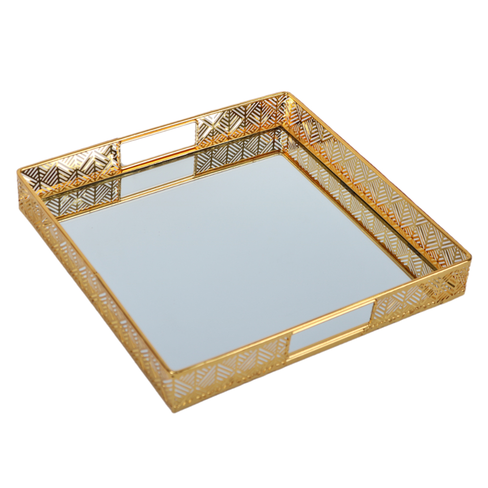 صينية بحواف ذهبية فاخرة ومرايا , للتقديم والضيافة في المناسبات والحفلات , تصميم فاخر وأنيق , مناسبة لتقديم المقبلات والحلويات والمشروبات والأطباق الجانبية للضيوف , سهلة التنظيف ,