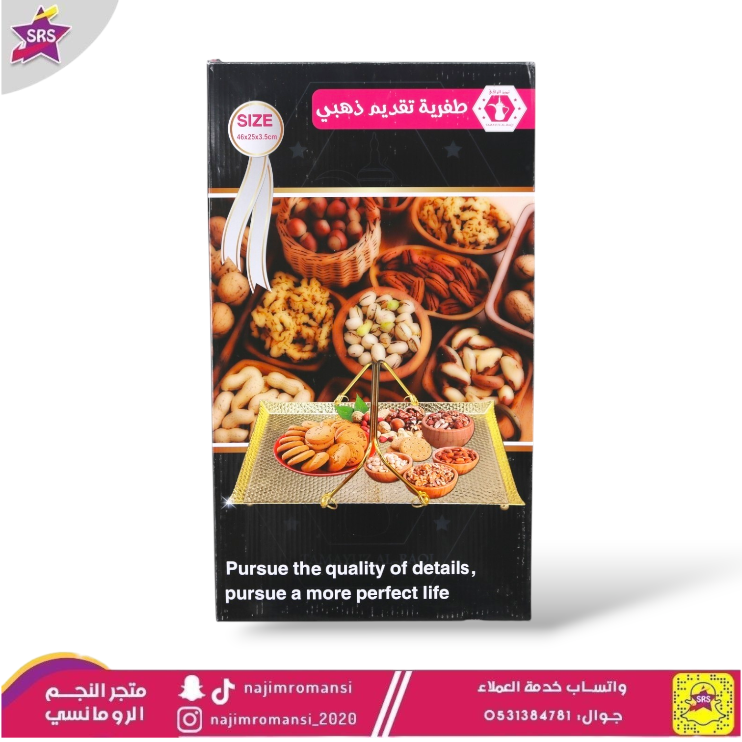 • بيانات المنتج (صحن تقديم ذهبي مستطيل مع مسكة كبير