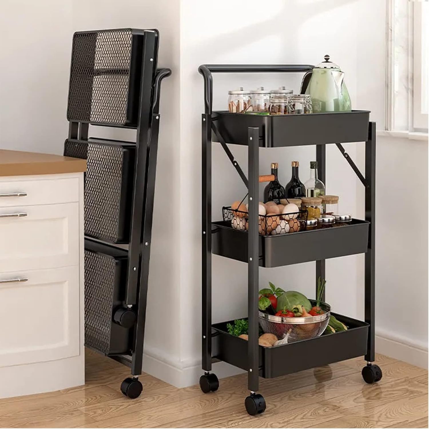 رفوف تقديم وتخزين 3دور بكفرات قابلة للطي اسود