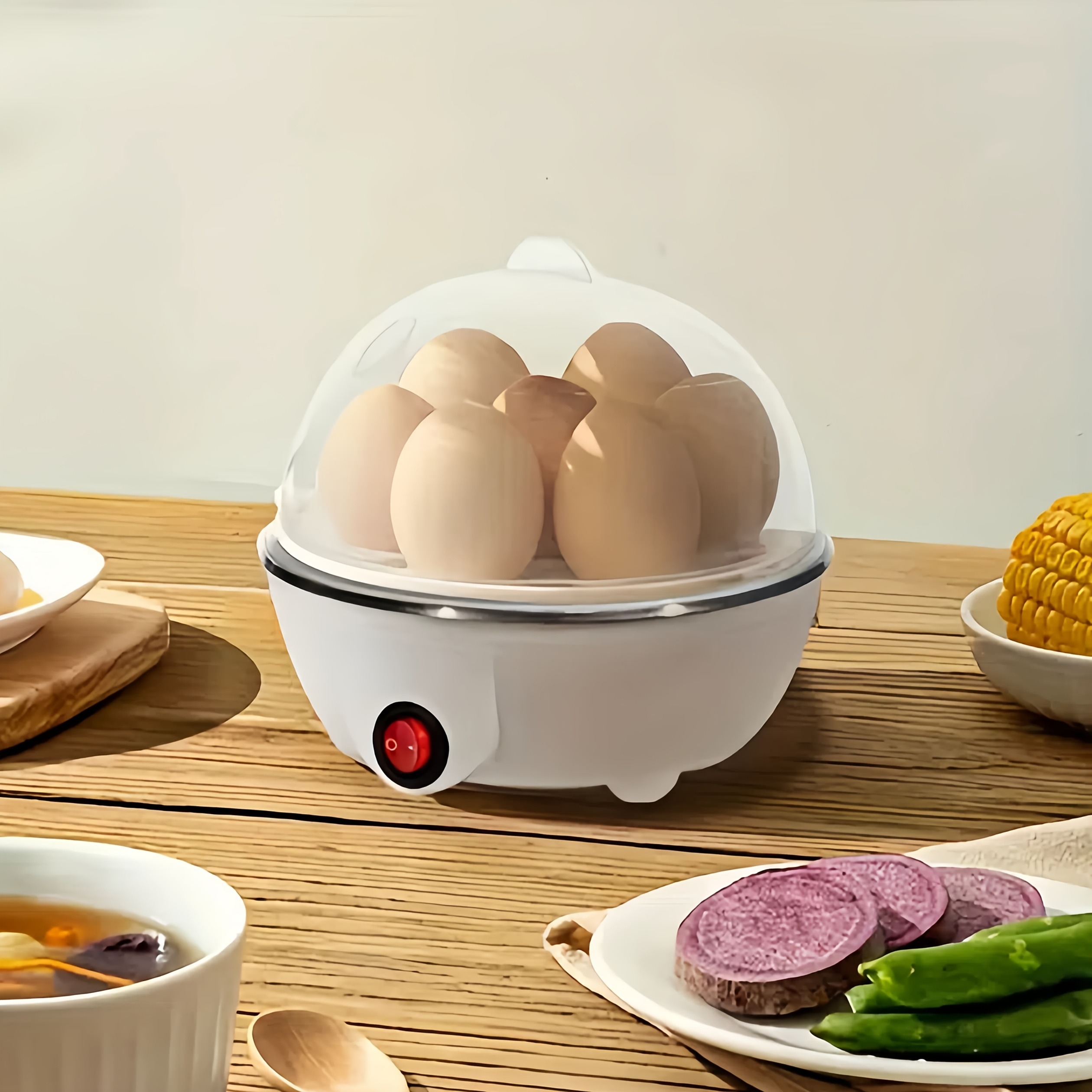 • ببساطة، أضف الماء باستخدام الكوب المرفق، وضع البيض على حامل البيض، ثم وصل الجهاز بالكهرباء. في دقائق معدودة، ستحصل على بيض مطهو على البخار بسرعة.