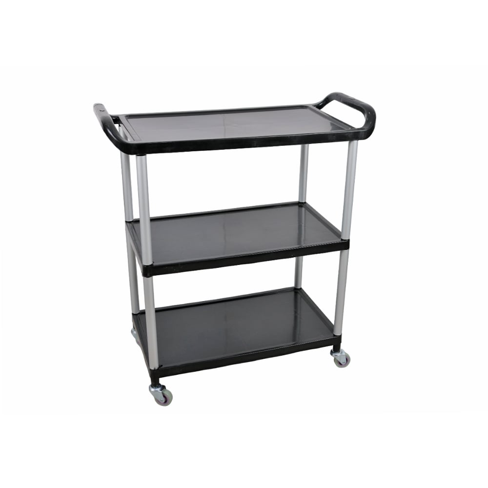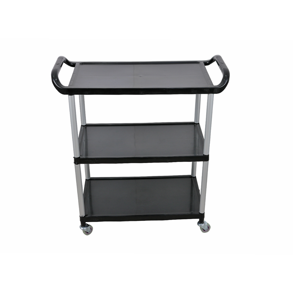 عربة اسود بلاستيكية بعجلات 3 طبقات عربة تخزين مع عجلات سهلة الحركة هي عبارة عن عربة متعددة الاستخدامات مثالية للمطاعم والفنادق. تم تصميمها بعناية لتلبية احتياجات التخزين والنقل في أماكن العمل هذه.